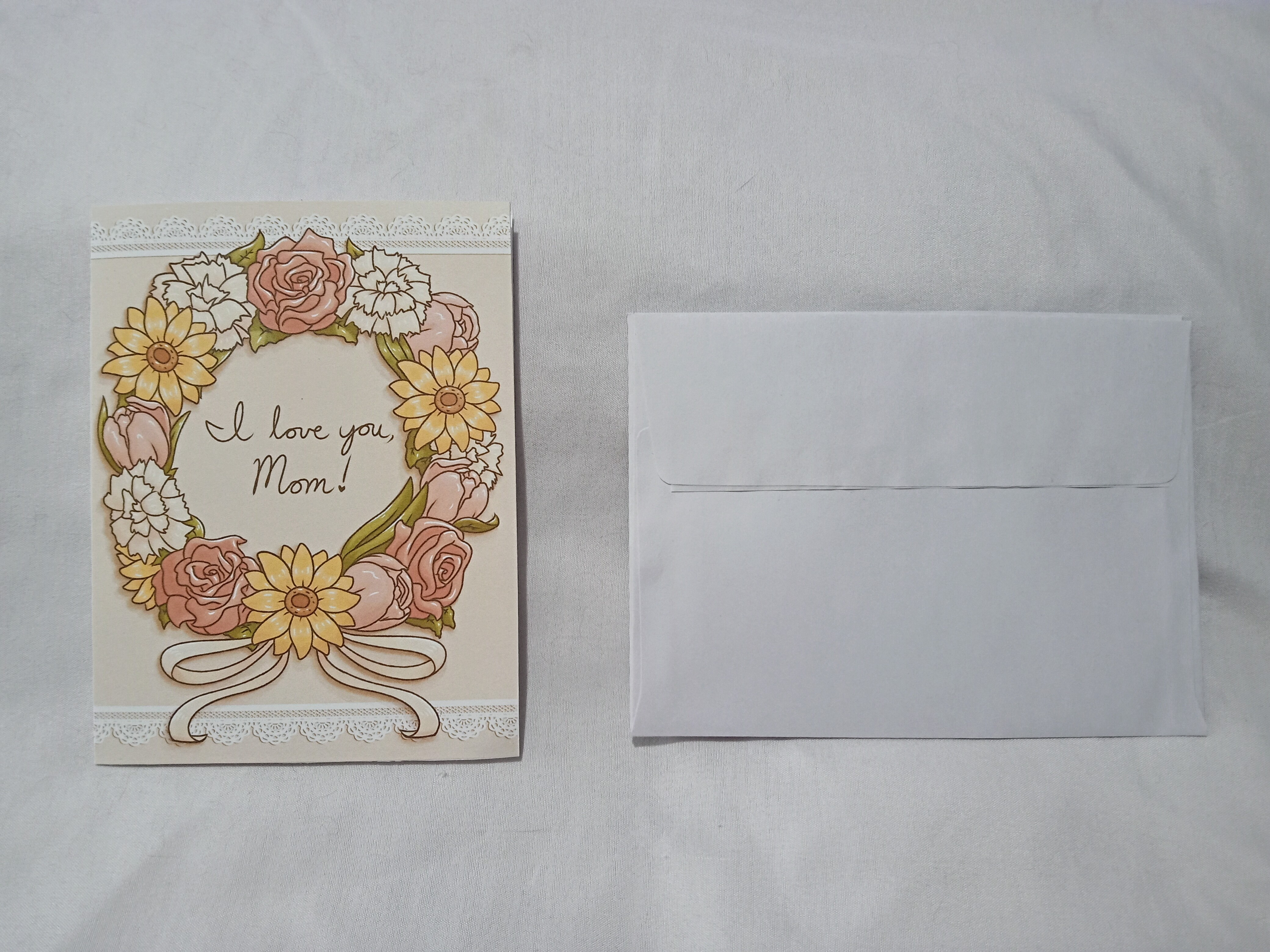 Front: A flower wreath with the message “I love you, Mom!”