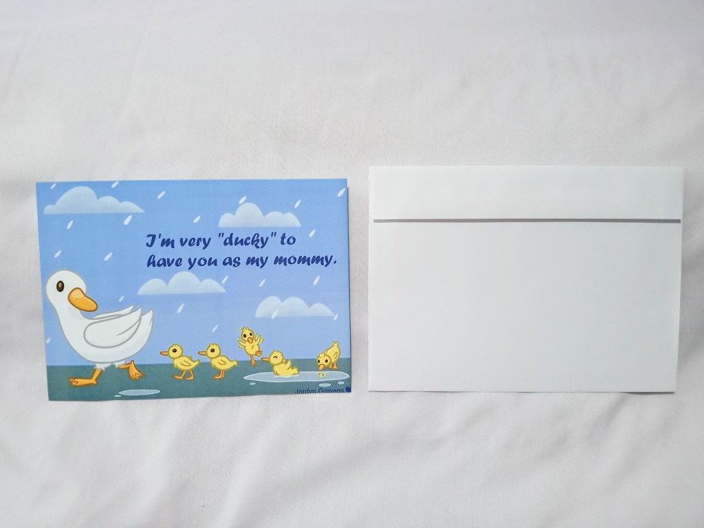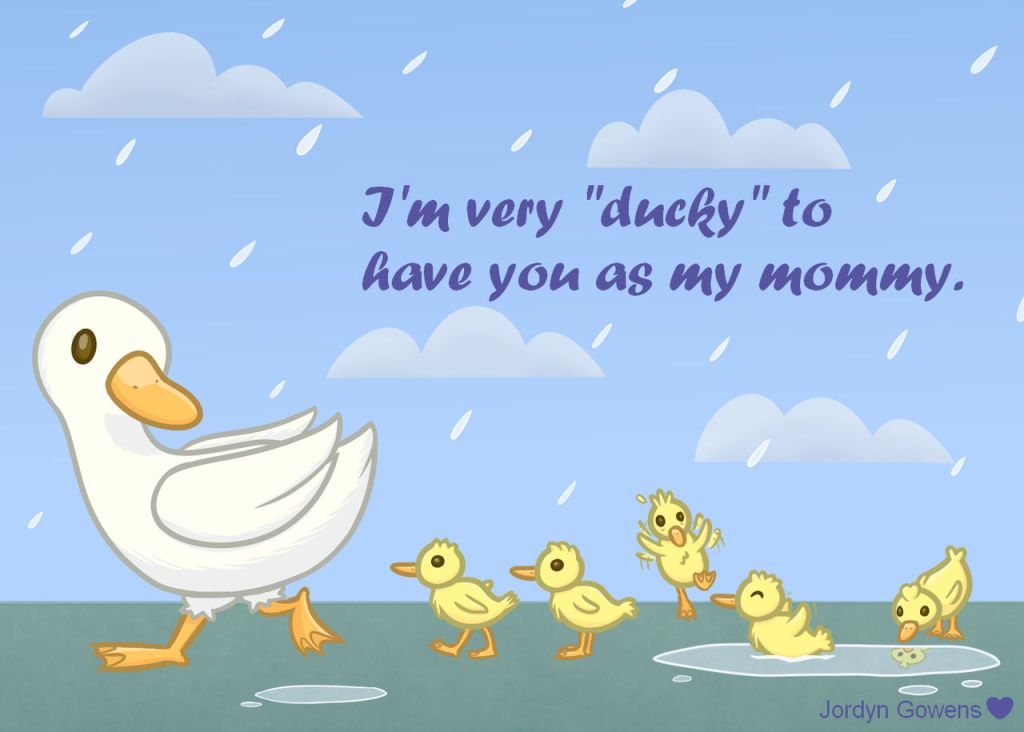 Front: A picture of a mother duck leading her ducklings on a rainy day. The text reads “I’m very ‘ducky’ to have you as my mommy.”