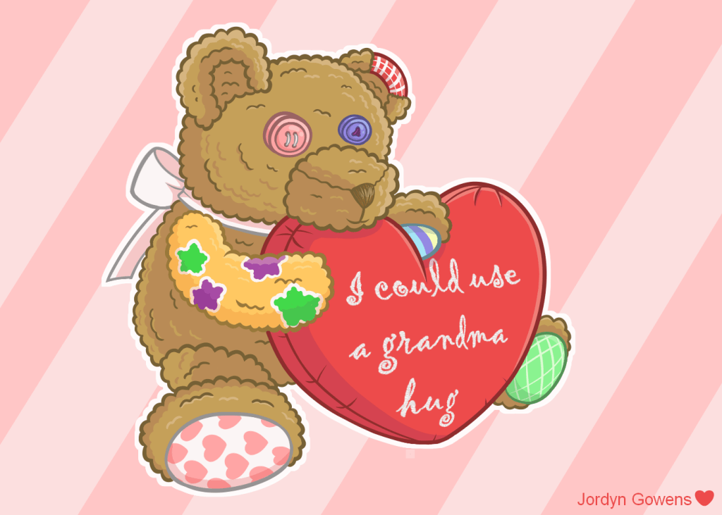 Front: A patchwork teddy heart hugging a heart-shaped pillow with the words “I could use a grandma hug” stitched on the front.
