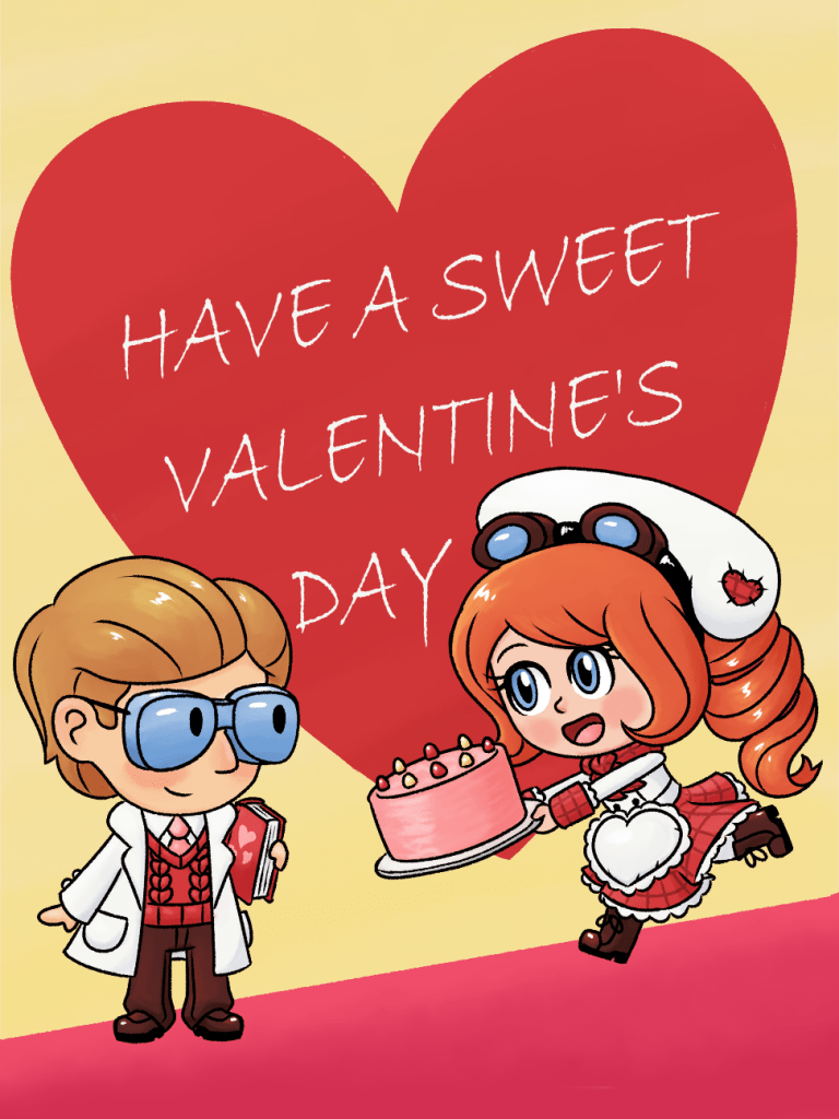 Front: A girl presenting a cake to a boy she likes. The heart in the background has text reading “Have a sweet Valentine’s Day”.